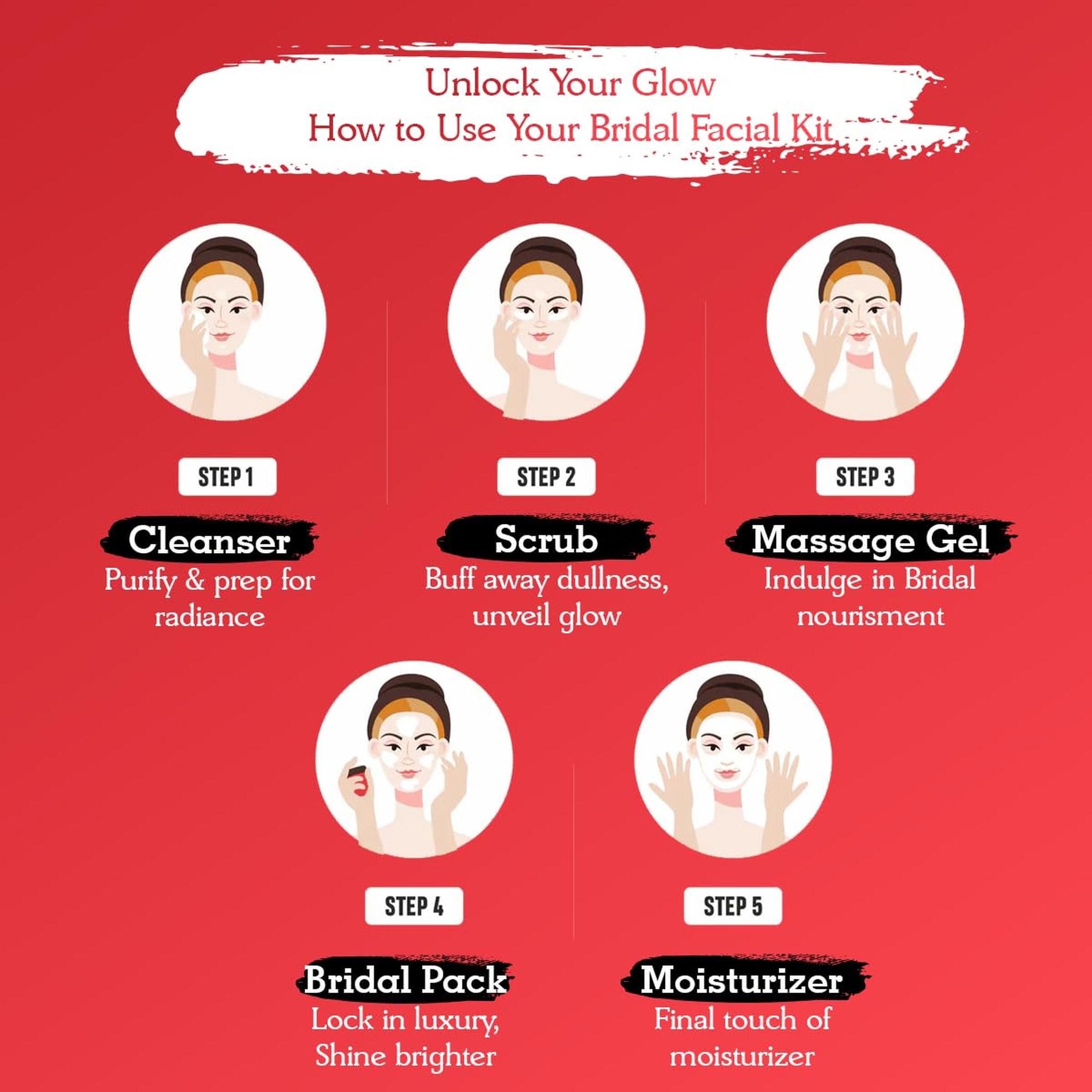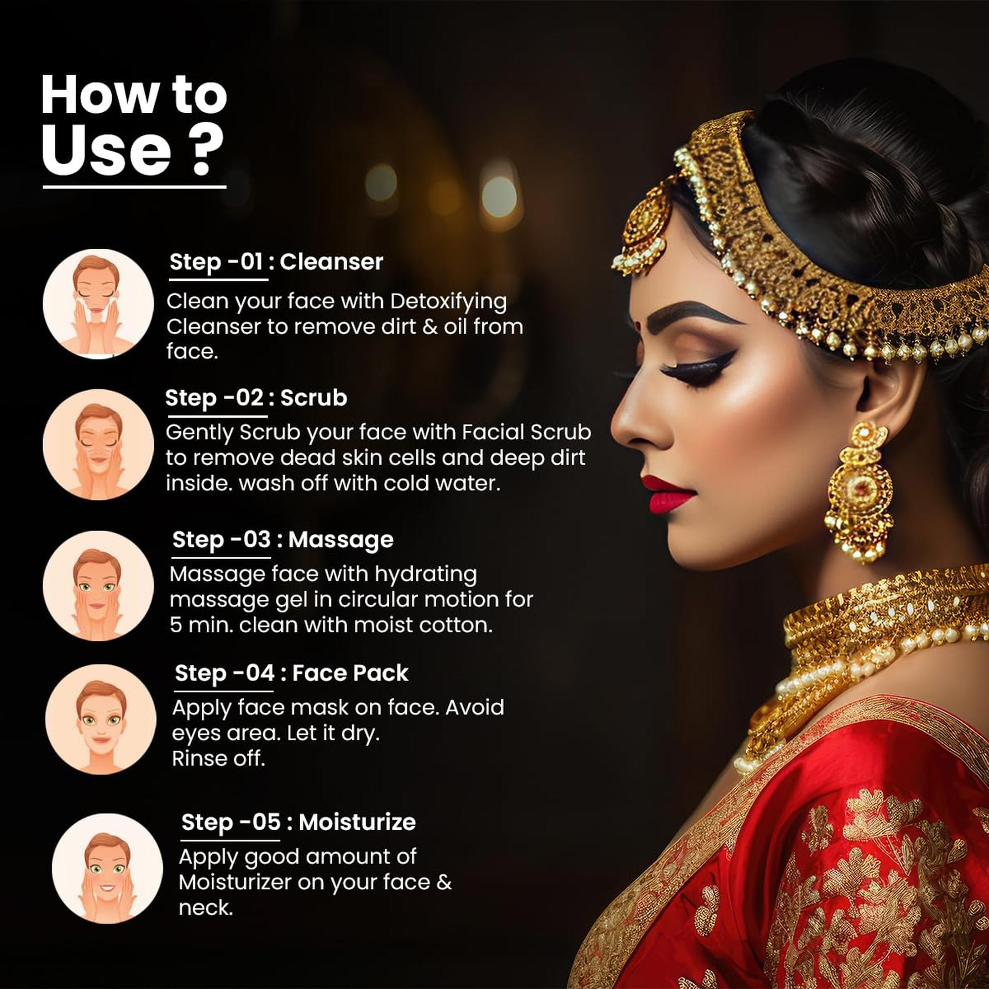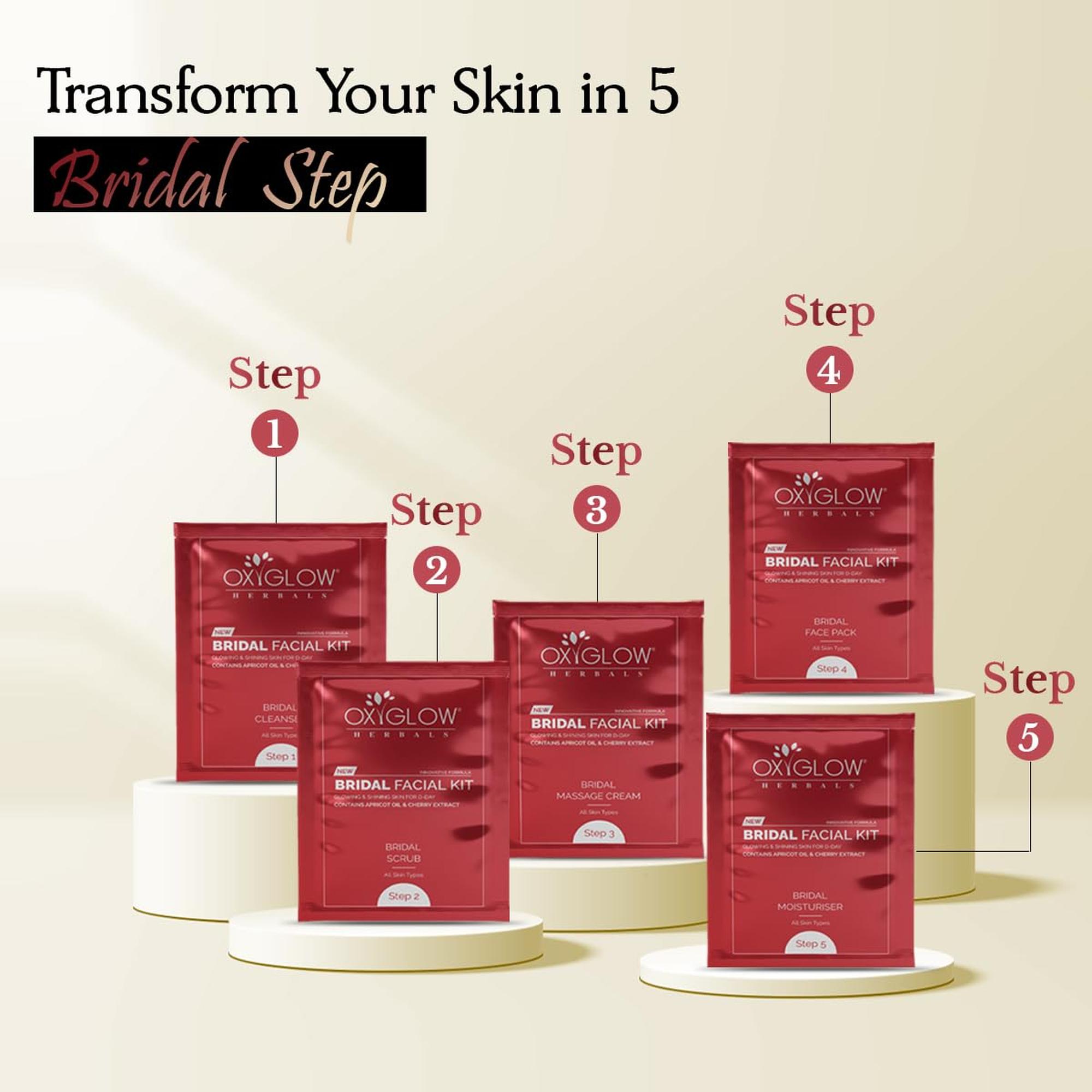 • OxyGlow Bridal Facial Kit contains 6 steps, which when used together work to deep cleanse and exfoliate your skin, remove dead skin cells, reduce melanin count, and help to reveal a beautiful glow. The products aid in giving an even tone and glow to your skin, which will help brighten and rejuvenate your skin Key Benefits: Enhances Natural Glow Imparts Dazzling Radiance Revitalize Skin All Skin Type