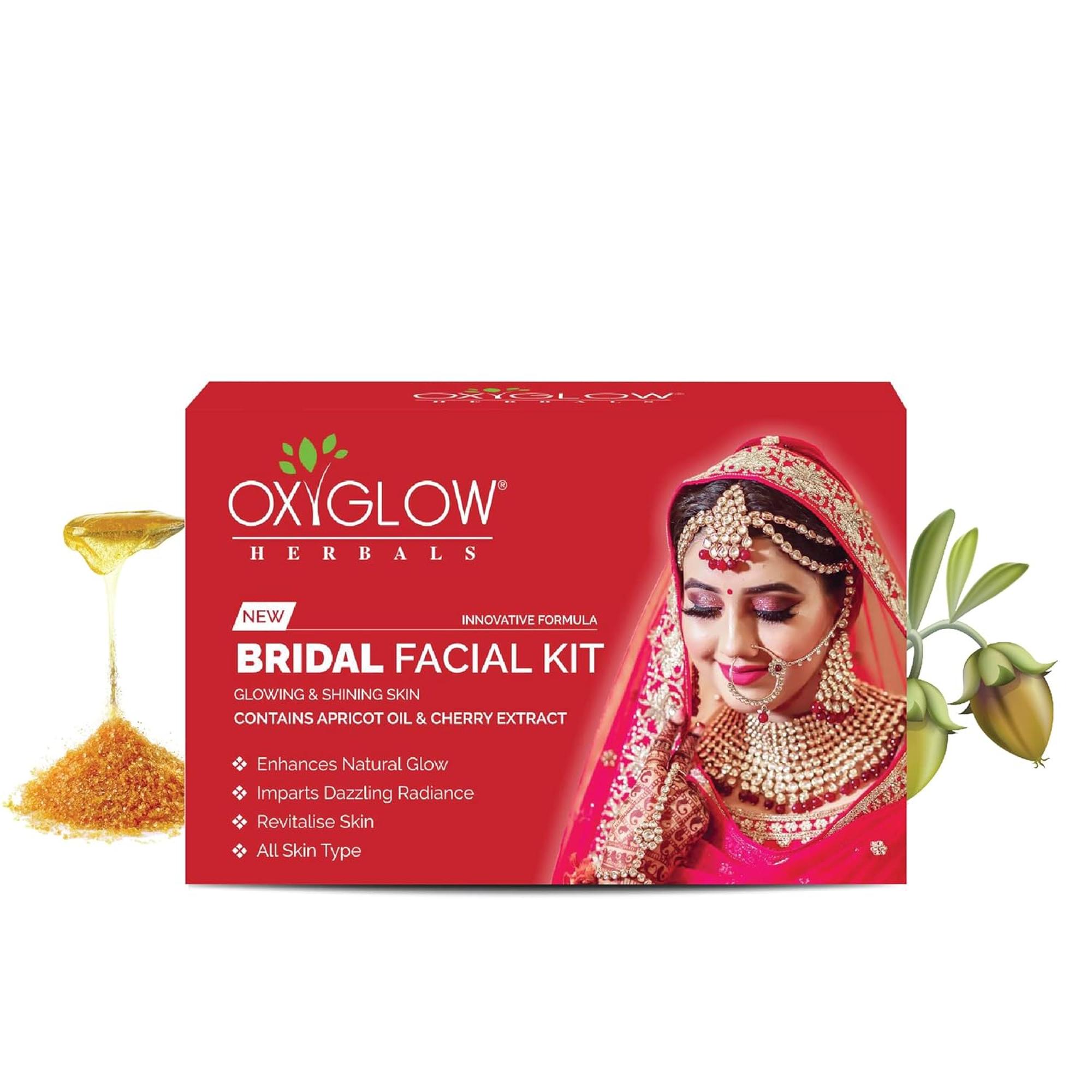 • BRIDAL FACIAL KIT CONTAINS APRICOT OIL & CHERRY EXTRACT OXYGLOW BRIDAL FACIAL KIT This facial kit have many benefits like purifies, nourishes, hydrates, moisturizes and contouring the facial structure making it all ready for a fresh bridal look Cherry extract, a potent antioxidant helps the skin defend itself against environment aggressor, combat duitness and correct hyper pigmentationwhile apricot all promotes the formation of collagen which improves skin’s strength, elasticity and radiance.
